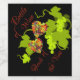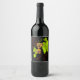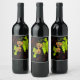 Classy black label with a bright green grape vine, also two hearts made up of all different fruits and written in a fancy red script, "Bottle of wine, fruit of the vine."