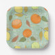 Fruit pattern with lemons, oranges, lime and grapefruit. Bright citrus fruits on a light green background with multicolored splashes of paint.