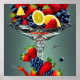 Photorealistic digital art poster features a variety of fruits dropping into water. Fruits include strawberries, lemons and blueberries. Great wall art for your kitchen, a smoothie bar or other places where fresh fruits are eaten/sold.