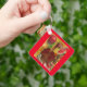 The key chain is made of metal and really sturdy. The flower design is really cheerful. The logo and colors are clear and crisp!