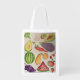 I own a lot of reusable grocery bags, but this one holds its box shape and simply stands up on its own even if there is nothing in it. Its stiffer than your regular reusable bag too, and the material is water resistant. I poured water on the exterior and it didn't penetrate inside to the other side. I'm buying a couple more. Wish I knew how durable these bags were or I would have purchased a few more with my initial order. I also like how it folds and buttons up when not in use, making it easy to put into a handbag or luggage. I haven't used this bag yet, as I purchased it for travel use, like when you're at the airport and need to small sturdy bag to place any airport purchases in, like food, souvenirs etc. I can tell you when you first see this bag, it looks very cheap, but after closer inspection of the material and the seams its a very sturdy reusable bag. I tested it out by putting some really heavy objects inside and I could not observe any stress to the bag at all. Another thing I like about it, is the fact the medium size that this is makes it easy to just carry it in your hand without the bottom of the bag scraping the ground, like most other bags do when you're short. That alone, deserves 5 stars. I just wish there were more colors to choose from! The PDX Airport Carpet printing looks just like the photo, and using this bag during travel might be a conversation piece when/if a native from Oregon happens to see it.