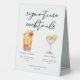 This garden wedding signature cocktails table tent sign features simple black typography above 2 drinks and their ingredients for your outdoor summer bar. A cute Tequila Sunrise and Lemon Drop drawing add a cool flair to your bar menu. Complete with the couple's names and date for their reception.