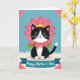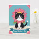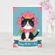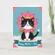 This card features an adorable cat-like character in a black-and-white tuxedo pattern, facing forward with a tender, friendly look that feels like a quiet “I’m here for you” ❤️. Around its neck sits a large fuchsia flower with many petals, like a soft collar, with small green leaves peeking out beneath. The character’s big shining eyes, tiny pink nose, and gentle smile add a romantic warmth without needing any extra props. It rests on a creamy white, fluffy ground that resembles tufts of grass or drifting clouds, set under a calm light-blue sky. Small geometric pink shapes sit near the upper corners, giving the scene a modern frame-like touch 🌼. Across the lower third, a teal ribbon banner stretches from side to side, carrying a celebratory message in white lettering centered on the ribbon. The lighting stays even and bright, making the fuchsia flower and teal banner stand out against the pale background. The teal banner has slightly curled ends, and the upper corners show those pink accents angled inward.