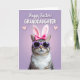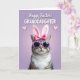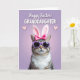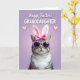 Designed with a pastel lavender background, this card centers on a striped tabby cat with a white chest ruff, dressed up for Easter 🐰. A bright fuchsia bow sits on its head, paired with soft upright ear coverings that give it a sweet, dressed-for-the-holiday look. Purple-framed sunglasses cover its eyes, adding a cheeky, friendly attitude that feels like a wink to someone you care about. The lighting stays gentle and diffused, showing off the fluffy fur against the smoother shine of the glasses. Near the top, white all-caps text reads “HAPPY EASTER! GRANDDAUGHTER,” set in two lines with “GRANDDAUGHTER” larger and centered beneath the greeting. Two small pink hearts sit on either side of the wording, suggesting a close bond without needing extra decoration 🌷. The letters have a faint shadow that helps them stand out against the lavender wash while keeping the overall look soft and tidy. The main colors are lavender, purple, and fuchsia, with the cat’s warm brown and cream stripes grounding the scene.