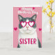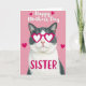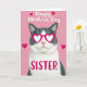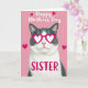 This card features a vertical portrait of a black-and-white cat looking straight out with a calm, affectionate gaze that feels like a friendly wink ❤️. Charcoal gray patches frame its face and ears, contrasting with a bright white muzzle and chest, and the cat wears oversized heart-shaped glasses in deep pink with solid white lenses. The background is a soft rosy pink, setting a cozy, caring mood like a warm hug shared between close family. Small heart icons are scattered around the cat, adding a gentle touch of romance and closeness 🌼. Fine white whiskers spread from the muzzle, and a small pink nose sits neatly at the center of the face. At the top, “Happy Mother’s Day” appears in white letters, with tiny dark-pink hearts nearby like little accents around the heading. Across the cat’s chest, the word “SISTER” is placed in large dark-pink letters that stand out against the white fur. The overall layout keeps the cat centered, with the rosy background and floating hearts filling the space behind it.