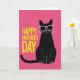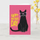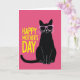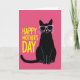 This greeting card features a sleek black cat silhouette on the right, posed with a gentle smile that feels like a friendly wink to someone special ❤️. The cat wears oversized sunglasses with soft pink frames, adding a flirty, fashion-forward touch that reads like a quiet inside joke between close friends. Thin white lines pick out the whiskers and paws, keeping the look simple while still giving the character warmth. The background is a rich fuchsia field that makes the dark figure and pale details stand out sharply. On the left, a cheerful message sits in large yellow letters, stacked to fill the space and balance the cat’s pose. The bright yellow text against the fuchsia looks like a sunny note passed across the room, with 🌼 energy that feels affectionate rather than loud. The overall layout keeps the cat and the message facing each other across the page, like they’re sharing a tender, lighthearted moment. The sunglasses are pastel pink with dark lenses, angled slightly upward over the cat’s face.