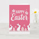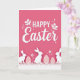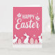 This greeting card features a tall, fuchsia background with large white lettering that reads “HAPPY Easter,” with “HAPPY” in neat uppercase near the top and “Easter” in a flowing cursive style just below it. Small white swirls and tiny star shapes tuck around the word “Easter,” adding a light, celebratory touch 🌷. Fine white drawings of blossoms and thin sprigs frame the top text like a soft floral border. Beneath the message, a layered paper-cut scene shows three white bunny shapes with long ears standing close together, their gentle spacing suggesting a quiet friendship 🐰. They sit in a field of cut white grass, where three decorated eggs rest nearby with polka dots, horizontal stripes, and wavy lines in pale pink and white. Little star-like flowers scatter around the eggs and grass, tying the lower scene to the festive header. Subtle shadows under the grass, bunnies, and eggs give the bottom section a stacked, dimensional look against the bright fuchsia backdrop.