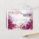 The postcard-style RSVP wedding card, an integral part of the "Fuchsia Enchantment: Watercolor Wedding Suite," features a picturesque front adorned with the captivating backdrop of fuchsia blooms and ivy creeper. At the top, a commanding caption reads, "Please Reply," followed by the date to respond by. Below, thoughtful options are presented for guests to indicate their response: "Accepts with pleasure," "Declines with regret." Additionally, three meat options, including a vegetarian choice, are available. Ample space is provided for guests to insert their names and state their meal preference, ensuring the couple can accommodate dietary preferences and restrictions.