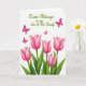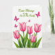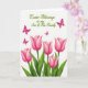 This card features five closed tulip-like blossoms rising from the lower edge, their petals shaded in fuchsia-pink with gentle gradients that suggest a velvety depth. Thick emerald-green stems and long, curved leaves sweep outward, as if leaning close together like family members in a quiet, affectionate huddle 🌷. Above the flowers, four small butterfly-like figures in matching pink drift upward in a loose scatter, adding a light, companionable energy to the scene 🐇. The background stays bright white, and the soft lighting keeps edges smooth with almost no harsh shadowing. Near the top, the message “Easter Blessings to my Son & His Family” sits centered in rich green lettering, standing out clearly against the white space. The green text visually echoes the stems below, tying the top and bottom together like a gentle conversation across the page. The butterflies appear at slightly different angles, with their wings open as they float above the blossoms.