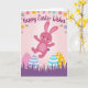 This design shows a stylized rabbit-like character in bright fuchsia, caught mid-leap with arms open and eyes softly closed, like it’s racing toward a friend for a hug 🐰. The figure sits in the upper-middle area, hovering above three decorated egg shapes that rest in a wide band of deep purple grass. Each egg has its own pattern—tiny dots, neat horizontal stripes, and scattered white circles—colored in gentle pink, lavender, and sunny yellow for a sweet, friendly rhythm. Behind everything, a smooth pink gradient background grows lighter toward the center, giving the scene a soft glow. Along the upper edges, small flowers and curling leaves in pale blue, warm yellow, and rosy tones frame the top like a garden border. Near the top center, a short holiday greeting appears in a flowing cursive-style font, set in a darker purple so it stands out clearly 🌷. The text sits just below the floral accents, while the rabbit’s open posture and the clustered eggs below create a cozy, togetherness-focused scene. The three eggs line up beneath the leaping character, nestled into the purple grass with their pastel patterns clearly visible.