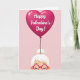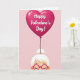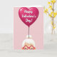 This greeting card shows a large fuchsia heart-shaped balloon filling most of the top of the design, with shiny highlights that make it look softly inflated. Across the balloon, the words “Happy Valentine’s Day!” appear in white cursive-style lettering, centered and easy to read. A thin black string hangs down from the balloon to a cartoon woman who peeks up from the bottom edge. She has white hair pulled into a neat bun with a small red band, and her eyes are closed with long lashes, giving her a calm, content look. Bright pink round glasses frame her face and match the balloon, tying the colors together. The background is a gentle, light pink that keeps the scene simple and cozy. It feels meaningful to give because it looks like a quiet, sweet way of saying “I’m thinking of you” ❤️. Hope it helps you share Valentine’s Day sentiments with someone you care about 🥰.