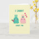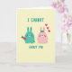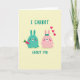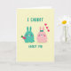 This card shows a pale yellow-green background that sets a gentle, cozy scene for two rounded, long-eared bunny-like friends 🐰. On the left stands a teal bunny with small dark eyes, soft pink cheek blush, and a tiny “3”-shaped mouth, leaning in as it holds a bright pink carrot with leafy green tops. Next to it is a blush pink bunny with the same sweet, simple features, facing its companion with a close, affectionate stance 🐇. A small teal bow sits between the pink bunny’s upright ears, adding a cute touch that echoes the teal figure beside it. Three fuchsia hearts hover above and slightly to the right of the pair, like a quiet hint of romance in the air. The phrase “I CARROT” is placed above the bunnies in teal, plain sans-serif lettering, centered to frame their heads. “ABOUT YOU” appears below them in the same teal type, balancing the layout under their feet. The carrot is bright pink with green leaves, and the hearts are a strong fuchsia against the soft background.