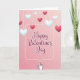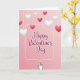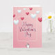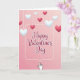 This Valentine's Day card features a soft pink background that fades from deeper pink at the bottom to a lighter blush at the top. Near the top center, the words “Happy Valentine’s Day” appear in deep crimson letters with a white outline, set inside a curved white frame that looks like a speech bubble. The lettering has a flowing, cursive look, and it stands out clearly against the pink. Below the frame, a simple cartoon pointer finger points upward, as if drawing your attention to the message. Around the scene, puffy heart shapes in pearly white and bright fuchsia float like balloons, each attached to a thin white string that reaches upward. The hearts have gentle shading that makes them look rounded and soft, giving the whole card a calm, affectionate feel. It’s a sweet choice for a partner or a close friend because it keeps the focus on love and kindness without saying too much 🥰❤️. Hope it helps you share your Valentine’s Day feelings in a simple, caring way.