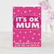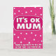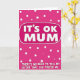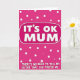 This greeting card features a rich pink background sprinkled with uneven white polka dots, giving it a lively, cheeky look that feels like a sibling joke shared with a knowing smile ❤️. Near the top center, a rounded rectangular speech-bubble shape sits prominently, outlined in white and set off from the dotted backdrop. Inside that bubble, the words “IT’S OK MUM.” appear in thick white uppercase letters with a slightly raised, soft-edged look. Beneath it, a longer line of white uppercase text stretches across the middle area, reading “THERE’S NO NEED TO TELL MY SISTER THAT YOU PREFER ME.” The spacing and high contrast make the message easy to read while keeping the tone light and teasing, like a friendly nudge between family members. The overall layout stays simple and punchy, letting the humor carry the connection without needing any extra illustrations 🌼. The white bubble outline and scattered dots remain visible around the text, floating over the fuchsia field.