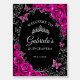 Fuchsia pink black silver Quinceanera welcome foam board sign. Features, script font, glitter silver butterflies, watercolor roses and tiara. Perfect for an elegant princess style glam celebration. Personalize with your own details. Printed Zazzle invitations or instant download digital printable template.