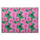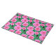 Placemat in a pattern of camellia flowers in shades of deep to pastel fuchsia pink, against a background of dark jade green leaves