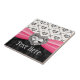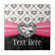 Personalize this glitzy hot pink and black damask rhinestone heart and diamond ceramic tile trivet with a fuchsia satin bow and repeating solitaire diamond and heart patterned design. Your name or text can be added to the bottom of the tile that is black with a subtle gray damask background. Artwork and design © Chrissy H. Studios, LLC. All Rights Reserved.