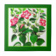 Ceramic tile in a vintage Medieval drawing of deep fuchsia pink Italian Hibiscus flowers, with an emerald green border