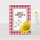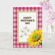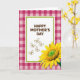 This greeting card features a white rectangular panel in the center with the words “HAPPY MOTHER’S DAY” set in rounded brown lettering. A lime-green border frames the panel, giving it a fresh, garden-like edge. Behind it, a fuchsia and light pink gingham pattern suggests a cozy tablecloth scene where family and friends might linger together. Beneath the message, five lightly outlined butterflies drift across the space, like little notes fluttering between loved ones ❤️. In the lower right, a large yellow flower overlaps the frame, its many petals spreading outward as if leaning in for a gentle hug. The flower’s textured green center adds a crisp contrast, drawing your eye the way a warm glance draws someone closer 🌼. The butterflies sit just under the text, and the oversized blossom fills the bottom-right corner with layered yellow petals around a detailed green core.