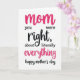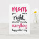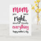 This greeting card features a tall stack of lettering centered on a bright white background, giving the words lots of breathing room. The main phrase is arranged vertically, with “mom” and “everything” in flowing fuchsia lettering that feels like a warm hug ❤️. Short supporting lines in black sit around those larger words, reading “you were right,” “about literally,” and “happy mother’s day,” with the smaller text tucked neatly above and below to guide the eye. The contrast between fuchsia and black creates a gentle push-and-pull, like a friendly tease that turns into affection. Little heart shapes replace the dots above the “i” letters, adding a quiet romantic touch without needing extra artwork 🌼. The spacing stays simple and centered, so the message reads clearly from top to bottom. Two tiny hearts sit where the “i” dots would be in “right” and “everything,” standing out against the crisp white background.