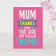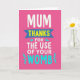 This greeting card features a highly saturated fuchsia background that sets a cheeky, affectionate tone ❤️. At the top, the word “MUM” appears in large, chunky white letters, like a friendly shout across the page. Just below, “THANKS” sits in sunny yellow inside a deep blue ribbon-style banner with pointed ends, giving it a celebratory look. The line “FOR THE USE OF YOUR” continues underneath in smaller rounded white lettering, with two short cyan dashes bracketing the word “FOR” as a neat accent. The final word, “WOMB,” lands near the bottom in a rounded cyan-blue style that feels soft and a little teasing, like a wink between close family or friends 🌼. Curving cyan flourishes sit on either side of that last word, adding a gentle decorative touch. The layout stacks each phrase in a centered column, with white, yellow, blue, and cyan text popping sharply against the fuchsia field. Two small cyan curved marks frame “WOMB” on the left and right, echoing the banner’s pointed ends above.