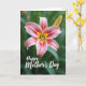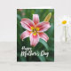 Designed with a close-up flower photograph, this card centers on a single lily-like bloom set against a softly blurred background of leafy greens. Six wide petals fan out in a balanced shape, with creamy white surfaces streaked by fuchsia and crimson lines that lead the eye inward like gentle, affectionate glances ❤️. Near the middle, a glowing golden-yellow throat radiates outward, creating a warm meeting point that feels quietly intimate. Dark-tipped stamens stand tall from the center, adding a rich contrast that makes the softer tones feel even more tender. A slim, tightly closed bud appears in the upper right in pale lime and buttery yellow, like a companion waiting nearby 🌼. Along the bottom edge, the words “Happy Mother’s Day” sit in white flowing lettering, clearly separated from the greenery behind it. Soft, diffuse light highlights the velvety texture and small ripples along the petal edges while the background stays dreamy and out of focus. In the upper right corner, the curled bud angles diagonally toward the open flower, framed by deep green leaves.