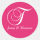 Customizable White Script Monogram T Wedding Sticker on a customizable pink background color. Customize with your names