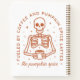 The phrase "fueled by coffee and pumpkin spice" captures a fun, autumn vibe, often featuring skeletons enjoying coffee and the popular pumpkin spice flavor.
