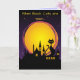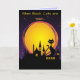 Full moon rises over a haunted looking mansion with spires while a black cat stares at you from its perch on the roof. Text on the front of the card "When Black Cats are seen..." and on the inside of the card "The moon laughs and whispers, Happy Halloween!"