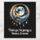 A wonderful and vibrant 3D looking full moon is floating above glowing blue fluffy clouds that have small stars twinkling in them. The moon is framed by a faux gold circle that has celestial signs hanging from it and it is set against a midnight black background that may be changed to any color of your choice. Editable white templates appear below the graphic. Ideal for a moon and stars wedding; for your special starry night themed anniversary or for any wiccan business; lodge or resort.