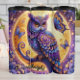 This is a detailed and whimsical illustration of a beautifully patterned owl perched on a branch under a large, glowing full moon. The owl is the central focus, adorned with intricate, mandala-like patterns in shades of blue, purple, and gold. It is surrounded by fluttering butterflies and smaller, glowing flowers in a dark, enchanted forest. The entire scene is mystical and magical, illuminated by the bright moonlight and sparkling dots of light.