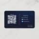 Elegant business card design featuring a rich deep blue background with luxurious gold accents. The front showcases your custom logo and business field, while the back includes a QR code linking to any platform you choose, the phrase “Contact me” for a strong call-to-action, and space for your phone number, email, and website. Perfect for creating a premium and memorable impression.