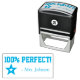 This motivating rubber stamp design features the encouraging message "100% PERFECT!" and a personalized teacher name. It also features a decorative star shape. It could be used by a teacher or educator when marking assignments, to acknowledge that the student has done well.