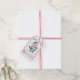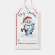 A whimsical Christmas tag showcases a cheerful snowman wearing a Santa hat, sitting on a toilet, surrounded by snowflakes. It's perfect for adding humor to holiday gifts.