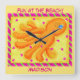 Decorate a room with a beach theme with this colorful orange and yellow name personalized wall clock. This art is great for both kids and adults in a whimsy art style. The whimsy octopus is orange and is on a yellow textured background and is surrounded by hot pink hearts. The design is framed by a hot pink fuchsia and lime green stripe border. This makes a great gift and is great for a beach home. This is created with original art by Phyllis Dobbs and is vibrant in the yellow, orange, and hot pink colors. Fully customizable for your enjoyment.