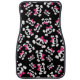 Cute skulls with heart eyes and pink bows pattern with black background.