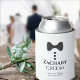 These fun foam can coolers are designed specially for the groom. They feature a fun design of a black tie with three buttons on a white background resembling a tuxedo. The text reads "Groom" and has a space for his name as well as the wedding couple & date. Use for beer, soda or any other canned beverage.