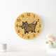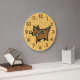 Cheerful and bright wall decor for a dog lover's home. Mellow orange colored dog wall clock with large 12 hour numbers. The clock is decorated with a cartoon of a dog carrying a bone with paw prints as a background. Great for adding a splash of color and joy to your home.