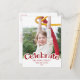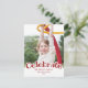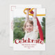 Fun and unique "Celebrate" text graphic in festive red curving font with photo template and editable text fields. Back features matching red border with additional editable text fields.