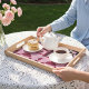The modern wooden serving tray showcases checkered hearts in soft carnation and deep wine-red pink tones. It's a charming addition for breakfast in bed or serving loved ones at a dinner party. Perfect for couples or family, this stylish tray doubles as a unique home and kitchen decor piece. The design also allows you to customize the background color to suit your preferences.