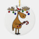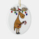 Cute funny Christmas moose with Christmas ornaments on his antlers and holding a candy cane.