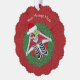 This hanging ornament card has a fun skeleton holding to shiny Christmas ornament balls up to his eyes inside a pine wreath wearing a Santa hat on a festive red background. Customize your text with the templates on the front and back.