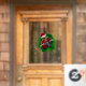 This window cling has a fun Christmas skeleton wearing a Santa Claus hat holding two ornaments up to his eyeballs peeking out from a vibrant green and red splatter shape.