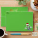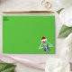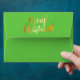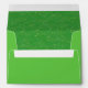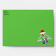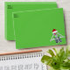 This envelope is green with a fun Christmas skeleton on the front in corner wearing a red Santa Hat holding up to shiny ornaments to his eyes. Merry Christmas text in bright gold is on the back flap and the inside is dark green with tiny gold flecks.