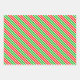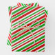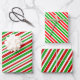 This wrapping paper design features festive patterns of red, white, and green colored Christmas-themed stripes. Wrapping paper like this might be used when wrapping presents and gifts being given to celebrate Christmas.