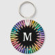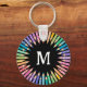 Colorful round keychain for a classroom personalized with the teacher's initial surrounded by colored pencils in soft rainbow colors. Colorful monogrammed keychain for your art studio personalized with initial in white against a black background with a lot of colored pencils all pointing toward the center and sporting rainbow colors.