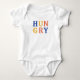 An cute bodysuit featuring a simple modern design with the quote HUNGRY in a vibrant palette of orange, blue and yellow