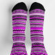 Purple Horizontal Striped Socks. Many shades of Purple stripes are mixed with fun patterns with splashes of colors in polka dots, zigzags, and checkered patterns.