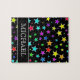 This fun, multicolored puzzle design features a pattern of star shapes of various sizes and colored a variety of colors on a black background. It also features a custom name.