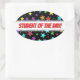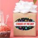 This fun, multicolored design features a pattern of star shapes of various sizes and colored a variety of colors on a black background. It also features the message "STUDENT OF THE DAY!".